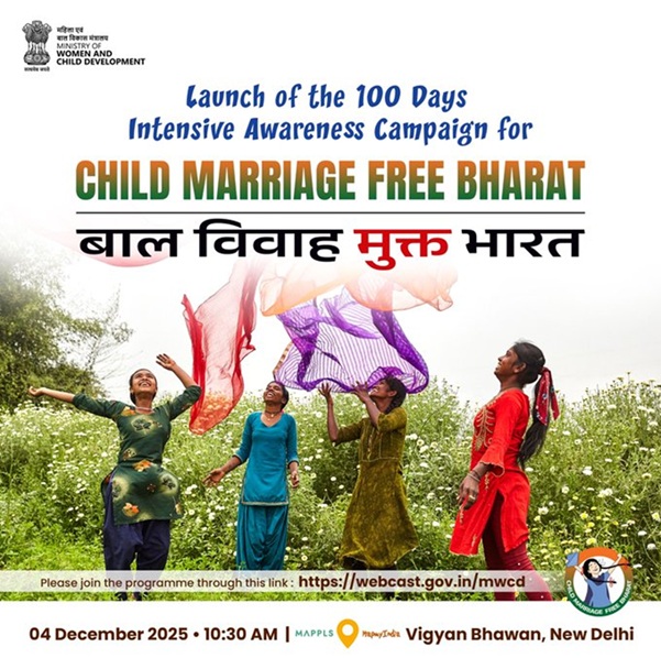 The Ministry of Women and Child Development (MoWCD) will formally launch a 100-day intensive awareness campaign on 4 December 2025 from Vigyan Bhawan, New Delhi. This campaign marks one year of the national initiative “Bal Vivah Mukt Bharat (Child Marriage Free India)”, which was initially launched on 27 November 2024.