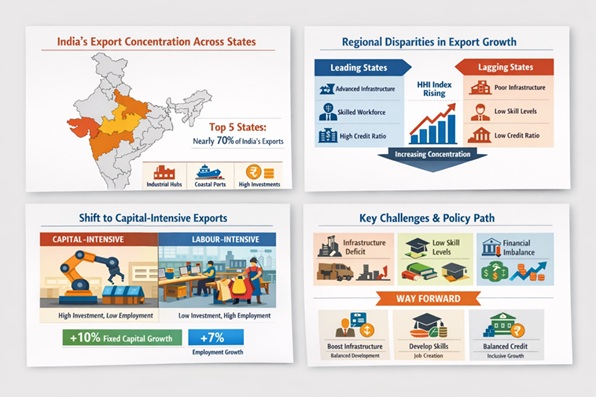 A recent analysis of RBI’s State-wise export data reveals that India’s export growth is increasingly concentrated in a few States, exposing deepening regional imbalances and questioning the assumption that export expansion automatically leads to broad-based industrialisation and employment generation.
