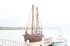 A stitched sailing vessel, inspired by a 5th-century ship depiction in Ajanta cave paintings