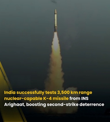India recently conducted a successful test of the K-4 submarine-launched ballistic missile (SLBM) from the nuclear-powered submarine INS Arighaat in the Bay of Bengal. The test demonstrated India’s ability to strike targets at a distance of around 3,500 km from underwater platforms, significantly strengthening its sea-based nuclear deterrence.