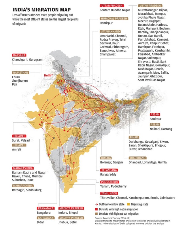 - Inter-state migration from Bihar, UP, Odisha → Delhi, Maharashtra, Gujarat