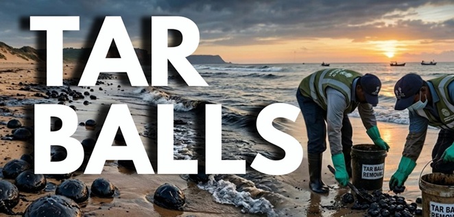 - Tar balls are a visible manifestation of such pollution, often appearing on beaches, especially along the western coast from Gujarat to Goa during seasonal months.
