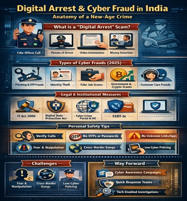 India has recorded a sharp escalation in cyber-enabled financial crimes during 2024–25, particularly a new form of intimidation-based fraud popularly termed as the “digital arrest” scam. Multiple incidents involving losses of several crores, prolonged psychological confinement of victims via video calls, and impersonation of senior law-enforcement or judicial officials have raised serious concerns. Courts and central agencies have taken cognisance of the growing threat, highlighting cyber fraud as not merely an economic crime but a challenge to internal security and public trust.