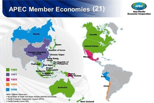 - सदस्य देश (कुल 21) : ऑस्ट्रेलिया, ब्रुनेई, कनाडा, चिली, चीन, हांगकांग (चीन), इंडोनेशिया, जापान, दक्षिण कोरिया, मलेशिया, मैक्सिको, न्यूजीलैंड, पापुआ न्यू गिनी, पेरू, फिलीपींस, रूस, सिंगापुर, चाइनीज ताइपे (ताइवान), थाईलैंड, अमेरिका, वियतनाम