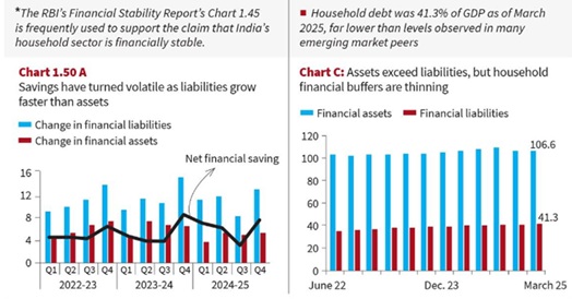 - हालाँकि, यदि हेडलाइन आंकड़ों से परे जाकर अर्थव्यवस्था के स्तरों को देखें, तो एक चिंताजनक प्रवृत्ति यह उभरती है कि भारत की विकास यात्रा अब उन परिवारों के कंधों पर टिकी है जिनकी बचत घट रही है और कर्ज बढ़ रहा है।