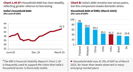 - भारतीय रिज़र्व बैंक (RBI) की ‘वित्तीय स्थिरता रिपोर्ट’ (दिसंबर 2025) के अनुसार, मार्च 2025 तक घरेलू ऋण जीडीपी का 41.3% था। चीन या थाईलैंड जैसे देशों की तुलना में यह आंकड़ा सुरक्षित लग सकता है किंतु संकट कर्ज की मात्रा में नहीं है बल्कि उसके उद्देश्य में छिपा है।