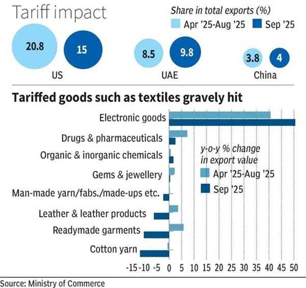 - सितंबर 2025 में भारत का अमेरिका को निर्यात 15% तक गिरा, जबकि अप्रैल-अगस्त 2025 में यह 20% था।