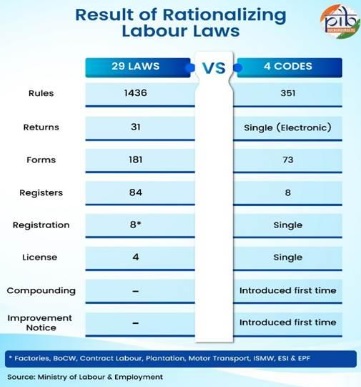 भारत का श्रम क्षेत्र देश की अर्थव्यवस्था एवं विकास का आधार है। बदलती आर्थिक परिस्थितियों, नई तकनीक एवं उद्योगों की विविध आवश्यकताओं के बीच सरकार ने श्रम कानूनों को अधिक सरल, आधुनिक व प्रभावी बनाने की दिशा में बड़ा कदम उठाया है। यही कारण है कि पुराने 29 श्रम कानूनों को सरल बनाकर 4 व्यापक श्रम संहिताओं (Labour Codes) में एकीकृत किया गया है-