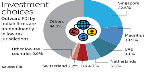 भारतीय रिजर्व बैंक के आंकड़ों के विश्लेषण के अनुसार वर्ष 2023-24 में भारत का लगभग 56% बाह्य प्रत्यक्ष विदेशी निवेश (FDI) निम्न कर वाले क्षेत्राधिकारों, जैसे- सिंगापुर, मॉरीशस, संयुक्त अरब अमीरात, नीदरलैंड, यूनाइटेड किंगडम एवं स्विट्जरलैंड में था। इनको प्राय: टैक्स हैवन देश कहा जाता है।