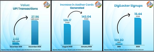 - डिजिटल प्लेटफ़ॉर्म पहचान सत्यापन, भुगतान, स्वास्थ्य, शिक्षा और शिकायत निवारण में योगदान देते हैं।