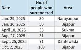 17 अक्तूबर, 2025 को छत्तीसगढ़ के दंतेवाड़ा क्षेत्र में 210 माओवादियों ने आत्मसमर्पण किया, जो राज्य सरकार के लिए ऐतिहासिक घटना रही। आत्मसमर्पण करने वाले माओवादियों में कई वरिष्ठ और केंद्रीय समिति के सदस्य शामिल थे। मुख्यमंत्री विष्णु देव साय ने इसे ‘अंधेरे रास्ते से संविधान के मार्ग पर लौटने का क्षण’ कहा है।