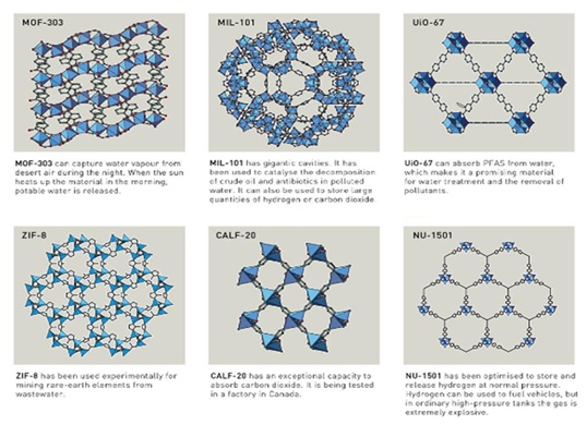 - इन्होंने ऐसे परमाणु बनाए हैं जिनमें बड़े-बड़े खाली हिस्से होते हैं, जिनसे गैस और अन्य रासायनिक पदार्थ आसानी से गुजर सकते हैं। इन संरचनाओं को मेटल ऑर्गेनिक फ्रेमवर्क्स (MOF) कहते हैं। इसमें ऐसे क्रिस्टल बनते हैं, जिनमें बड़े खाली हिस्से होते हैं।
