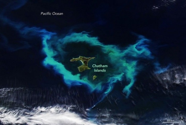 हाल ही में दक्षिणी गोलार्ध की ग्रीष्म ऋतु (जनवरी 2026) के दौरान चैथम द्वीप समूह के आसपास समुद्र में फाइटोप्लांकटन की असामान्य वृद्धि (Bloom) दर्ज की गई। यह वृद्धि इतनी व्यापक थी कि इसे अंतरिक्ष से NOAA-20 उपग्रह के VIIRS सेंसर द्वारा स्पष्ट रूप से देखा गया। समुद्र की सतह पर हरे और नीले रंग के घुमावदार पैटर्न उभर आए, जो उच्च जैविक गतिविधि का संकेत देते हैं।