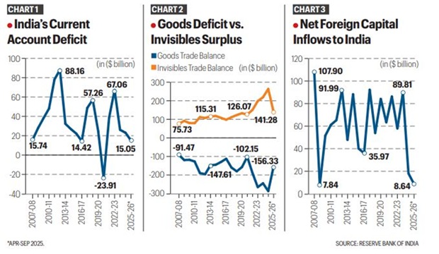 - विशाल अदृश्य अधिशेष ने वस्तु व्यापार घाटे को लगभग संतुलित करके चालू खाते घाटे (CAD) को नियंत्रण में रखा है। अप्रैल-सितंबर 2025 में CAD गिरकर $15.1 बिलियन हो गया, जो यह दर्शाता है कि CAD रुपये के दबाव का मुख्य कारण नहीं है।