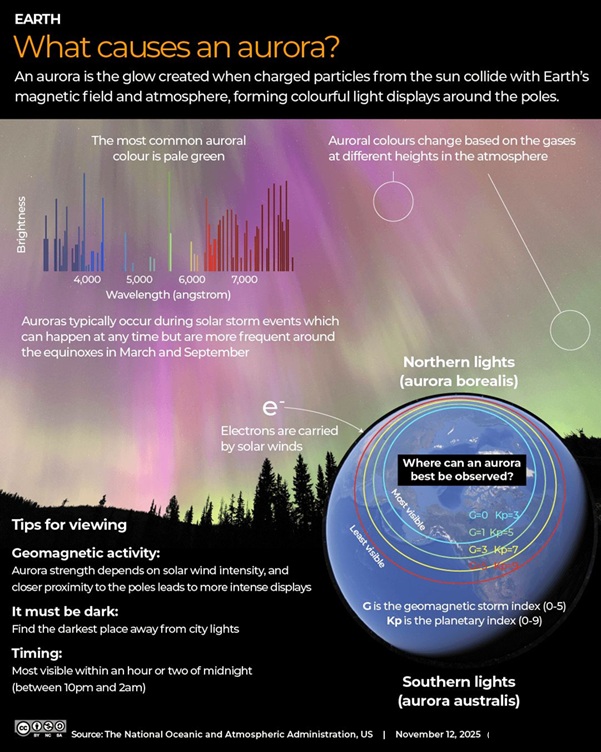 - जब सूर्य से आए उच्च-ऊर्जा कण पृथ्वी के ऊपरी वायुमंडल में मौजूद गैसों जैसे नाइट्रोजन और ऑक्सीजन से टकराते हैं, तो वे गैसों को प्रेरित (excite) करते हैं।