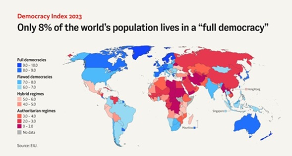 2023 में दुनिया के लगभग 47% देशों में लोकतांत्रिक मूल्यों में गिरावट दर्ज की गई।